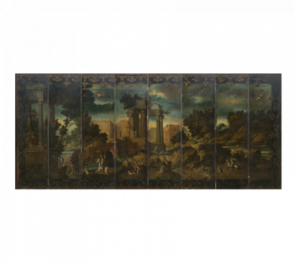Compuesto por ocho hojas, este biombo nos muestra la narración pictórica de una escena de caza del ciervo como principal protagonista. Un conjunto de cazadores a pie y a caballo con perros corren a la caza del ciervo; unos con lanzas otros con escopetas, otro con un cuerno para llamar a los perros. Todos, se van sucediendo a lo largo de un primer plano de la composición. A la izquierda, la caza victoriosa de un oso, el pintor nos coloca al hombre frente al oso, cara a cara y es considerado como rito de iniciación para los cazadores jóvenes. El cazador totalmente protegido por su armadura, golpea al asa con su espada al que le acompaña otro joven con armadura y escudo. En los siguientes planos, el pintor inmortaliza los distintos momentos de la actividad cotidiana de sus habitantes, uno pescando, otro pastoreando las ovejas, otros atravesando un puente…La escena se sitúa sobre un paisaje de exuberante vegetación, entra las que se colocan distintas cascadas edificaciones y ruinas clásicas en distintos planos.