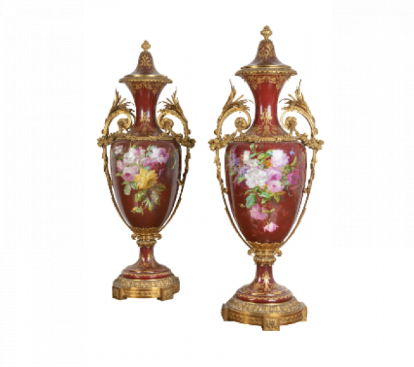 Pareja de jarrones de estilo Luis XVI, de opalina de fondo rojo con flores pintadas y bronces cincelados y dorados. Con un sello* en cada una de las tapas.