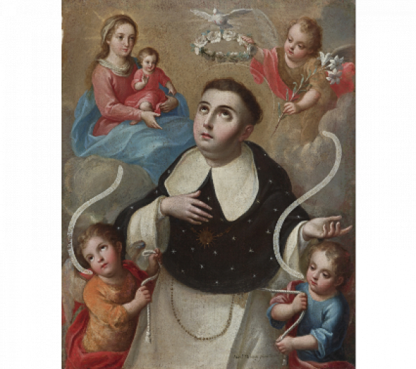 La obra que presentamos, firmada por Miguel Cabrera y procedente de la antigua colección del Marqués del Valle de Oaxaca de Madrid, retrata un momento crucial en la vida del eminente teólogo dominico. En esta obra, vemos a Santo Tomás de Aquino durante la imposición del cíngulo de castidad por una pareja de ángeles. La leyenda que rodea este episodio relata, que desde temprana edad Santo Tomás sintió una vocación religiosa profunda y se unió a la orden de Santo Domingo. Sin embargo, su familia, intentó obstaculizar su camino, incluso llegando al punto de secuestrarlo y encerrarlo en un castillo durante un viaje. A pesar de los esfuerzos de persuasión, incluso empleando la artimaña de la tentación por parte de una mujer, Santo Tomás permaneció firme en su compromiso religioso. En un acto de devoción, ahuyentó a la mujer y trazo una cruz en la pared antes de postrarse en oración, implorando a Dios que se mantuviera casto. Fue en ese instante cuando dos ángeles descendieron para consolarlo y ceñirle el cinturón de castidad.
