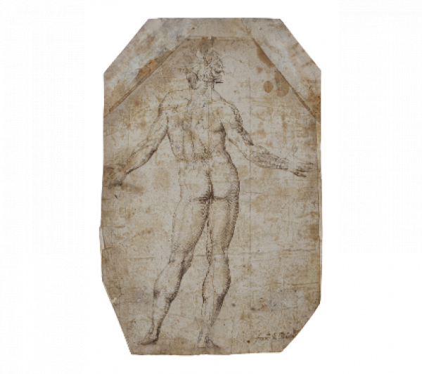 Se trata de un bello dibujo de gran corrección anatómica. Representa una figura masculina de espaldas en un marcado contrapposto praxiteliano que obliga a desplazar el peso del cuerpo hacia una de las caderas, creando así un sinuoso movimiento en “S” que, además, obliga a acentuar el juego de la musculatura, especialmente de la espalda. A ello contribuye la apertura de los brazos y el giro del cuello y la cabeza. Aunque tan solo se aprecia parte del rostro, el artista ha sido capaz de dotarle de una gran fuerza expresiva a través del teatral gesto y el cabello alborotado. El dibujo está realizado con seguridad a base de certeras y finas líneas de tinta, utilizando un característico rayado para producir las sombras y el volumen.