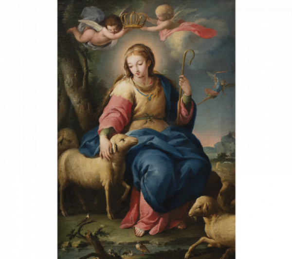En esta escena, el pintor José Camarón nos presenta a la Virgen María sentada rodeada de ovejas en su papel de pastora del rebaño de fieles y cuidadora de las almas. La Virgen viste con túnica rosa y manto azul, y el pintor inmortaliza su característico modelo femenino: de rostro delicado, dulce, de gran belleza y mirada baja, que también encontramos en otras obras del artista. En la parte superior de la composición, dos ángeles dispuestos a coronar a la Virgen, mientras que, en el fondo se vislumbra a San Miguel Arcángel descendiendo para liberar a una oveja portadora de una filacteria inscrita “Ave María”. En un primer plano de la composición destacamos la pareja de perdices a orillas de un riachuelo. La riqueza estilística, la magnífica ejecución de pincelada segura y ciertos toques empastados para realzar los volúmenes, el juego cromático de azules, rosas y verdes hacen de esta obra una verdadera joya artística.