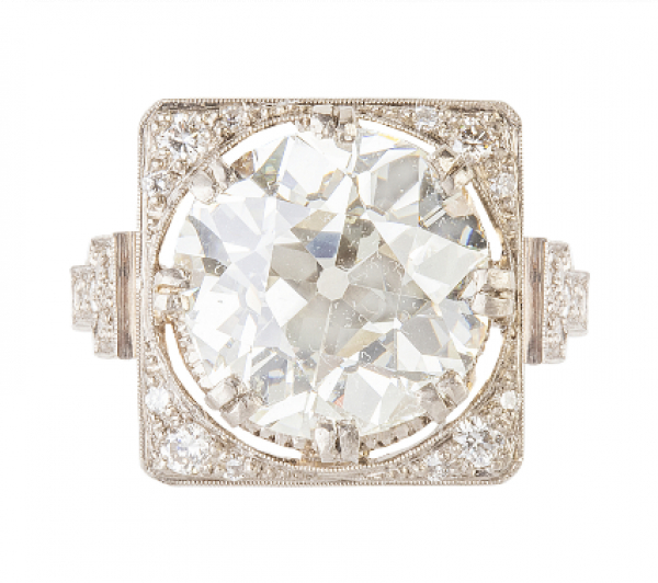 Sortija Solitario de brillante Art-Decó con un brillante central de talla antigua de 8,30 ct, color estimado M y grado de pureza estimado SI2.