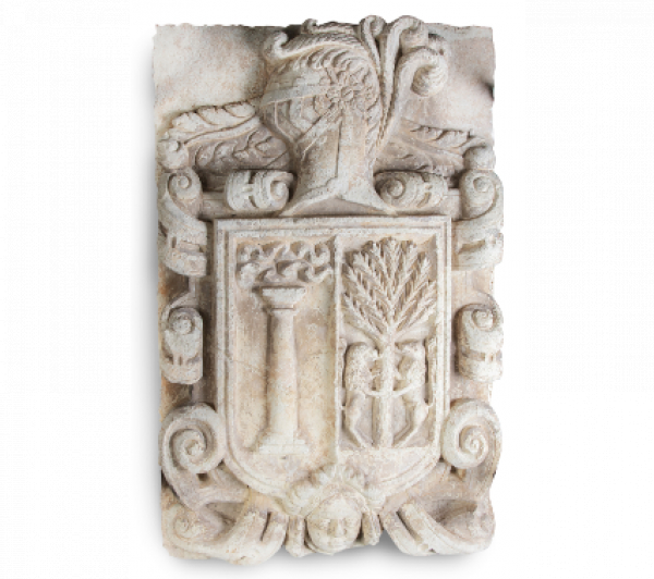 Escudo nobiliario de piedra tallada con decoración de cueros recortados. Trabajo español, ff. del S. XVI - pp. del S. XVII