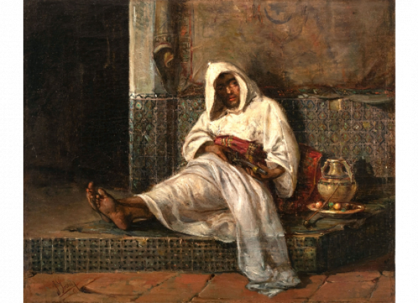 Nuestra obra, fechada en 1881, representa al primer Sorolla orientalista, siguiendo los modelos ya establecidos y recordando a Fortuny, pero por herencia de sus maestros Pinazo y Domingo Marqués. En un ambiente muy decorado, propio del orientalismo español, se detiene en describir con cuidadosa minuciosidad el interior dando veracidad a una realidad que no conoce. La figura del árabe aparece sentado envuelto en una túnica blanca que deja ver apenas sus brazos y sus pies. Se apoya sobre una pared revestida de espléndidos azulejos y un tapiz. La luz de la escena que se proyecta, más intensamente en la túnica, enfatizando el blanco y creando volúmenes, también matiza otras zonas como el rincón del bodegón formado por un plato de frutas, un jarrón y una pipa. Con un dibujo definido y un tratamiento del color excelente construye una escena de interior donde ya podemos ver el gran talento del pintor desde tan temprana edad.