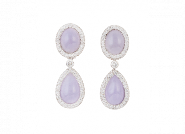 Pendientes largos de brillantes y jade lavanda, con óvalo superior y gota colgante. La gota presenta en reverso idéntico trabajo al de la parte frontal. En oro blanco de 18K.