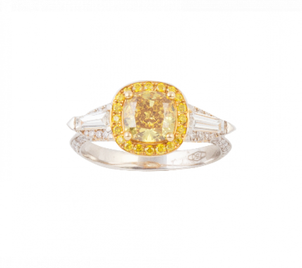 Sortija con diamante Fancy talla cushion de 1,50 ct flanqueado por diamantes talla baguette, y con brillantes decorando la montura y los brazos de engaste.