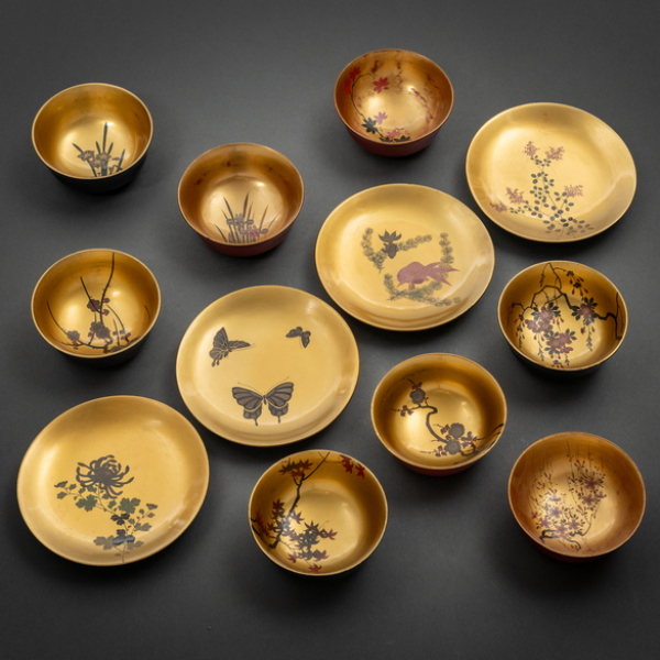 Conjunto de 8 bowls y cuatro platos japoneses lacados en dorado del siglo XX.