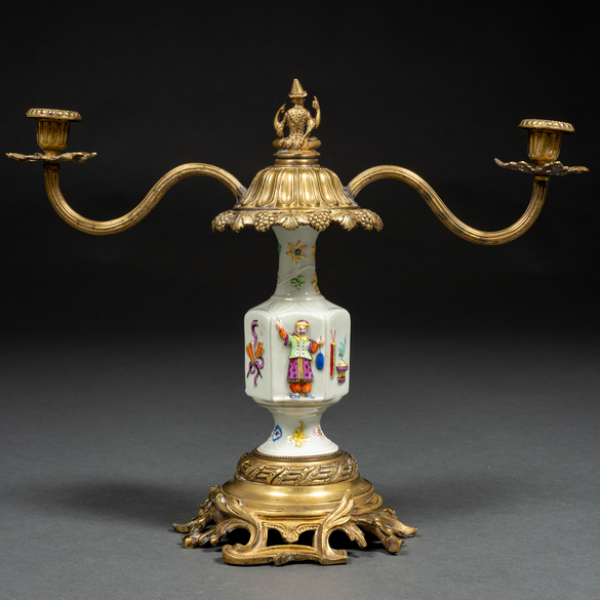 Candelero chino de dos luces en porcelana china con elementos decorativos en relieve del siglo XX.