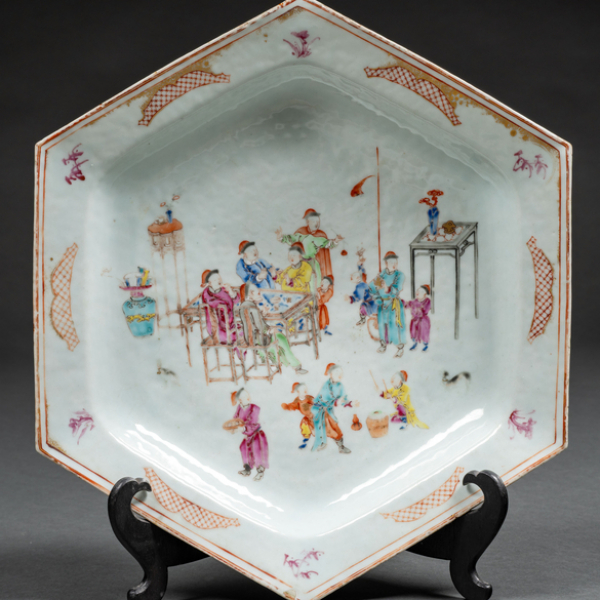 Plato octogonal en porcelana china familia rosa periodo Quianlong (1736-1795)