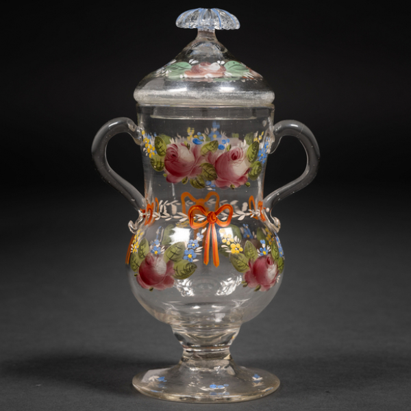 Compotera de cristal traslúcido esmaltado con flores en cristal de la Real Fábrica de la Granja de finales del siglo XVIII-XIX