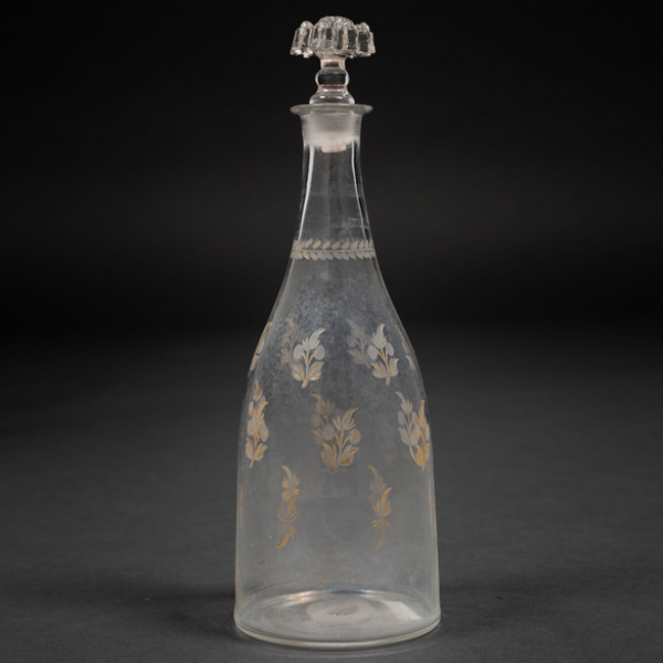 Botella en cristal traslúcido esmaltada con motivos florales de la Real Fábrica de cristales de la Granja de finales del siglo XVIII-XIX.