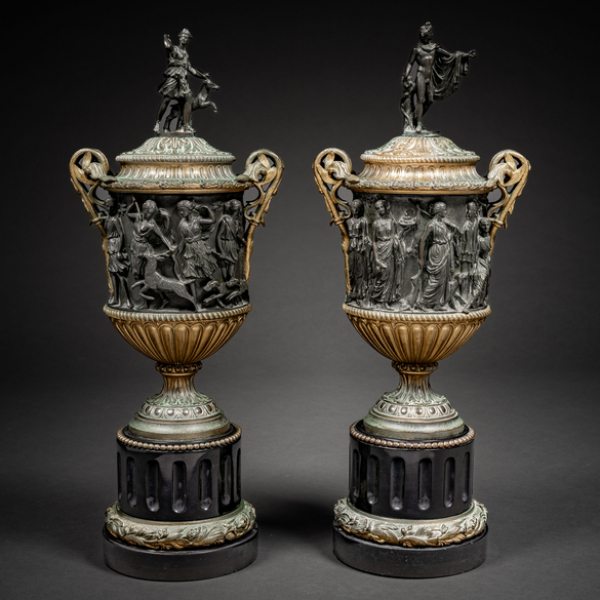 Pareja de urnas Grand Tour en bronce pavonado, bronce dorado y mármol negro del siglo XIX