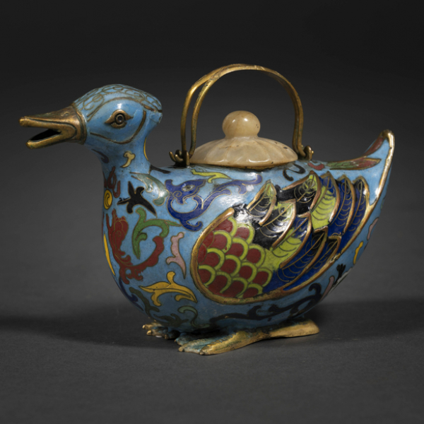 Pato en esmalte chino cloisoné con tapa en jade del siglo XX.