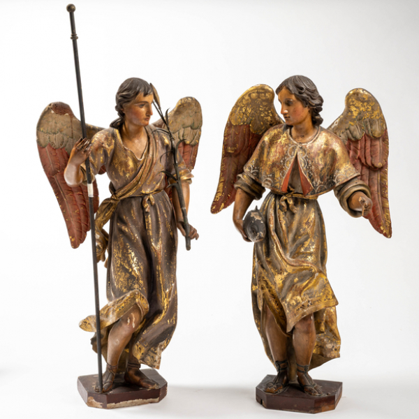 "Arcángel Gabriel y Ancángel Rafael" en madera tallada y policromada. Trabajo Novohispano, S. XVIII
