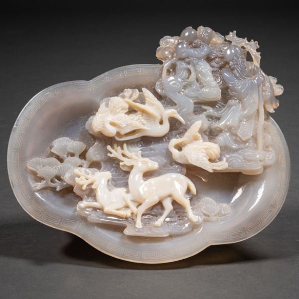 "Anciano de la Antigüedad con niños y animales" Grupo escultórico en piedra de ágata de dos colores del siglo XX.