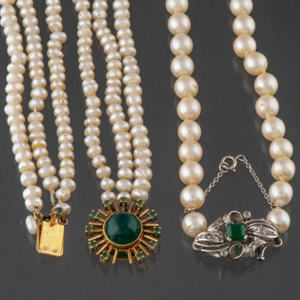 Uno de los collares formado por perlas cultivadas y cierre en oro blanco con esmeralda central y pequeños brillantes.