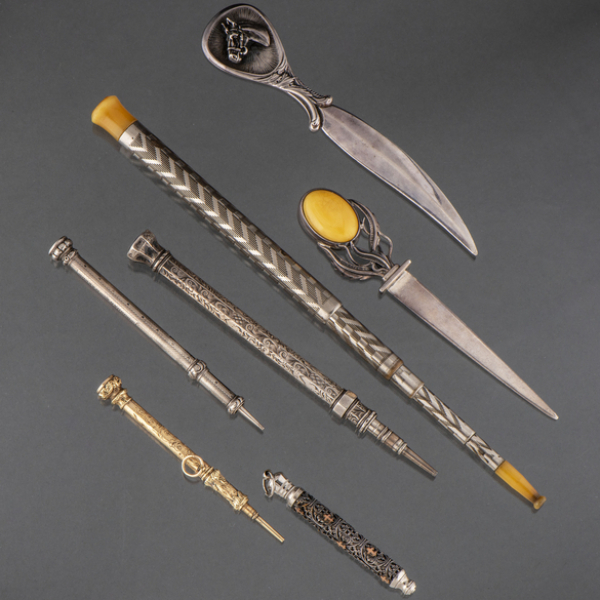 Compuesto por cuatro lapiceros en plata, dos abrecartas en plata y un lapicero en plata.