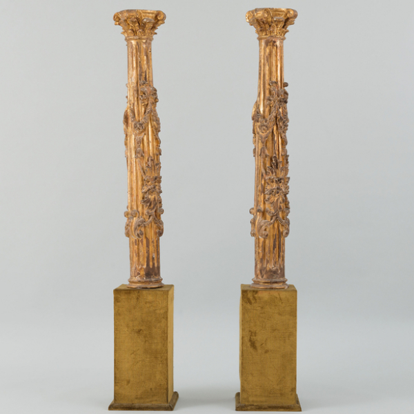 Pareja de columnas en madera tallada y dorada. Trabajo Español, Siglo XVIII.