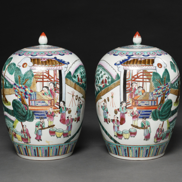 Pareja de Tibores Chinos en porcelana familia rosa. Trabajo Chino, Segunda mitad del Siglo XX