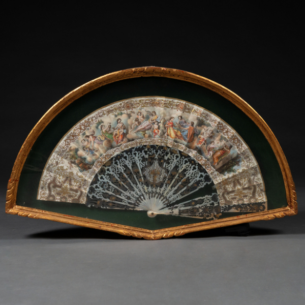 Medidas: Abanico: 30 x 52 cms. Abaniquera: 38 x 65 cms.