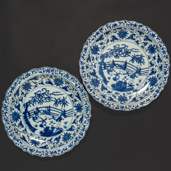 Pareja de platos en porcelana china azul y blanca. Trabajo Chino, Siglo XX