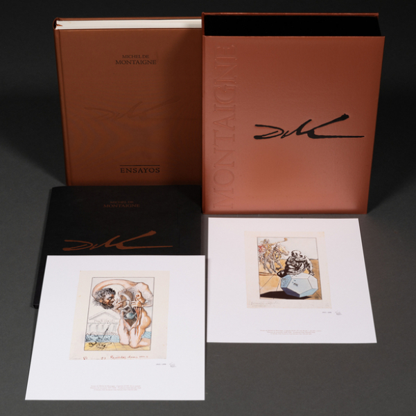 Estuche artesanal. El volúmen incluye 21 dinujos en tinta china negra y 16 a tinta china pintados con acuarela. Todos numerados y con el sello de la Fundación Gala- Salvador Dalí. Se complementa la obra con un libro de estudios que nos permite profundizar en la obra de Montaigne y Dalí. Encuadernación en seda color cobre y ejemplares de los ensayos.
