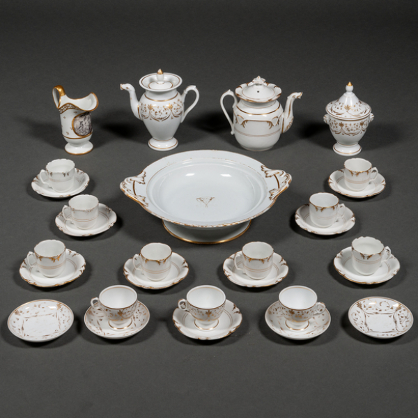 Conjunto de fuente, jarrón, cafetera, lechera, azucarero, jarrón, bandeja, 11 tazas y 13 platos en porcelana francesa de Viejo París. Siglo XIX