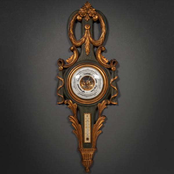 Barómetro Termómetro estilo Luís XVI en madera tallada y policromada en verde y dorado. Siglo XX.