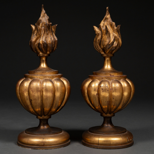 Pareja de remates en forma de llama en madera tallada y dorada del siglo XVIII