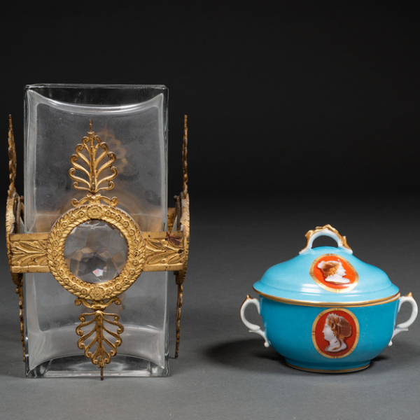 Conjunto de centro en cristal con estructura en bronce dorado y centro en porcelana esmaltada en azul con decoración de efigies clásicas.