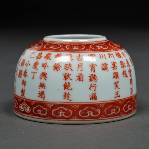 Recipiente chino en porcelana color rojo con letras. Trabajo Chino, Siglo XIX-XX