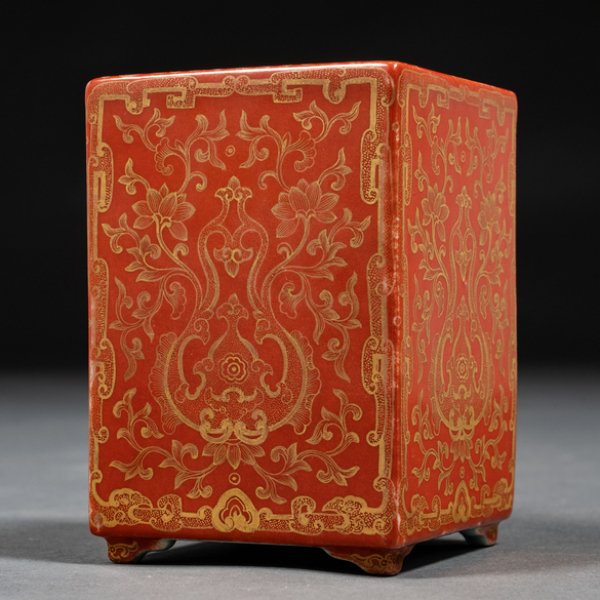 Bote de pinceles en porcelana china color rojo con decoración en dorado. Siglo XIX-XX