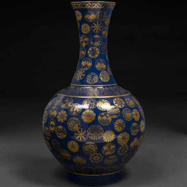 Jarrón en porcelana china color azul con decoración de motivos circulares en dorado dinastía Qing(1644-1912)