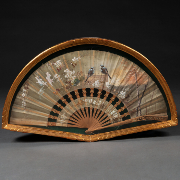 Abanico con varillaje en madera y país en seda pintado a mano con escena de pájaros y niños en ambiente bucólico.