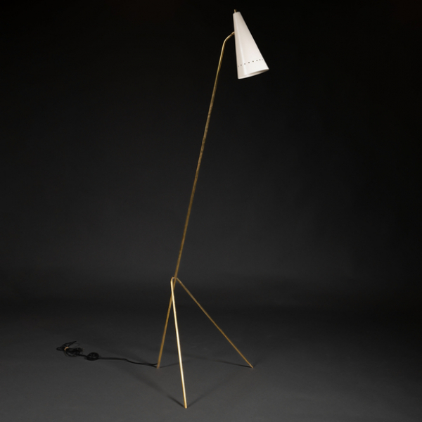 Lámpara de pie diseño Angelo Lelli realizada en latón dorado y tulipa en blanco.