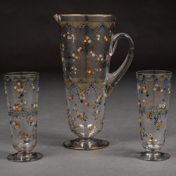 Conjunto de jarra y dos vasos realizados en cristal con decoración floral del siglo XX