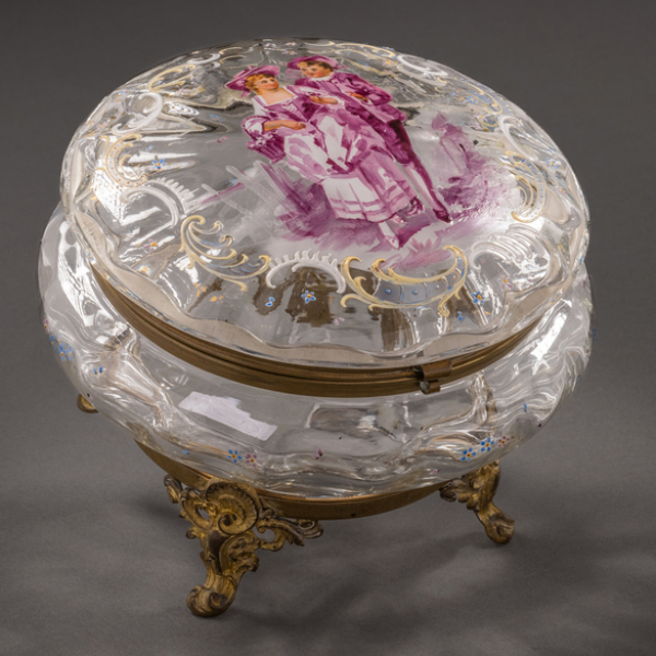 Bombonera en cristal con escena de galanteo pintada a mano con montura en bronce dorado de finales del siglo XIX.