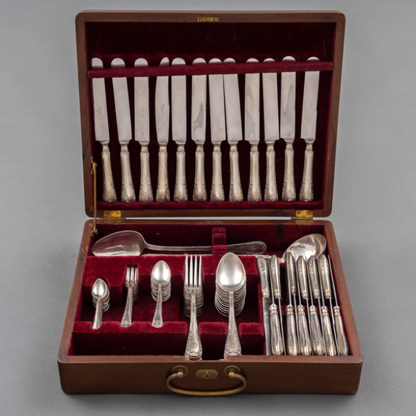 Compuesto por : 12 cucharas de sopa, 12 tenedores de carne, 12 cuchillos, 12 cucharas de postre, 12 tenedores de postre, 12 cucharillas de café, 12 cucharas de pescado y tres palas de servir.