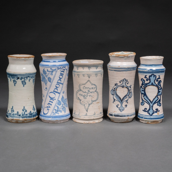 Conjunto de cinco albarelos en cerámica de Aragón. Siglo XVIII
