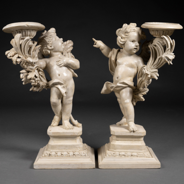 Pareja de ángeles torcheros en madera tallada y policromada en blanco. Siglo XX