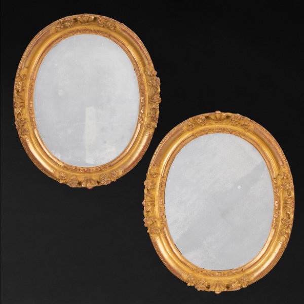 Pareja de espejos ovalados en madera tallada y dorada del siglo XX.
