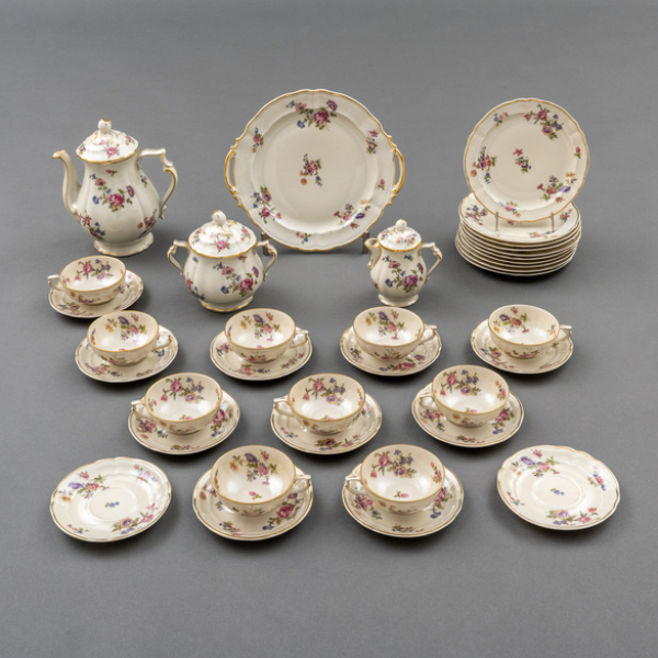Compuesto por: diez tazas con sus platos, doce platos de postre, bandeja, cafetera, lechera y azucarero.