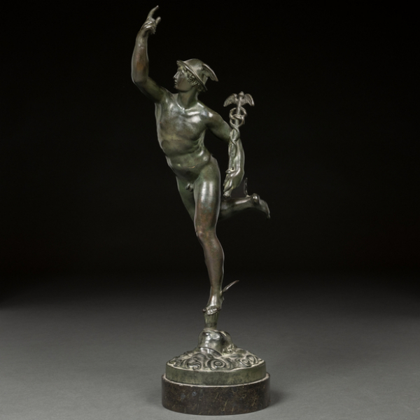 "Mercurio" Escultura realizada en calamina con base de mármol circular. Siglo XIX-XX