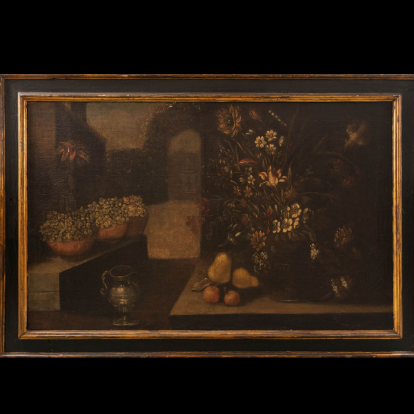 "Bodegón de flores, peras, jarra de pico con fuente de agua al fondo" ESCUELA ESPAÑOLA DEL SIGLO XVII