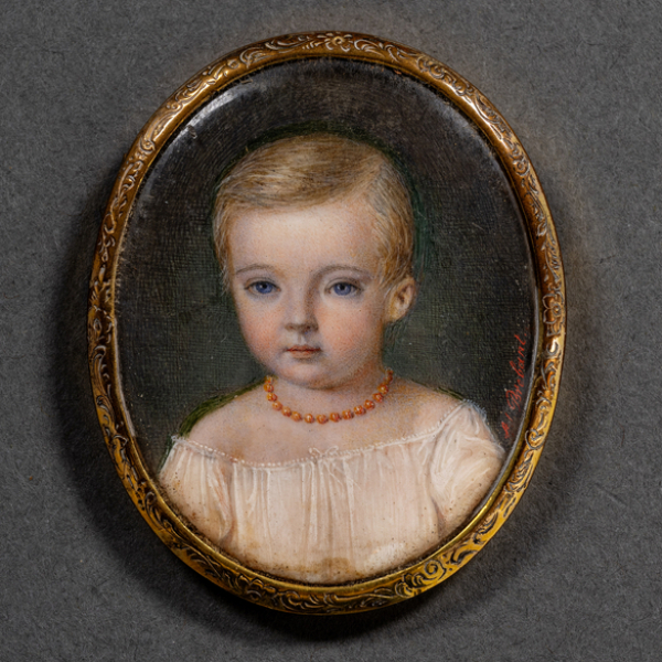 "Retrato de niña con collar de coral rojo" Miniatura pintada sobre placa de madreperla.