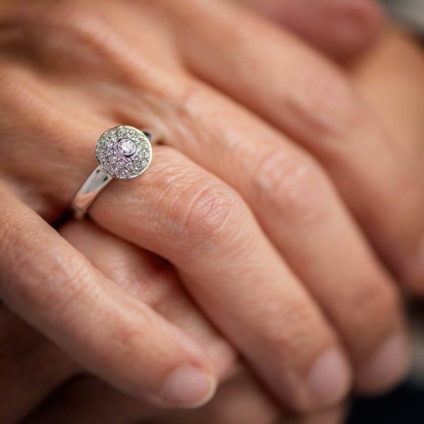 Anillo en oro blanco de 18kt en forma de rosetón con brillantes