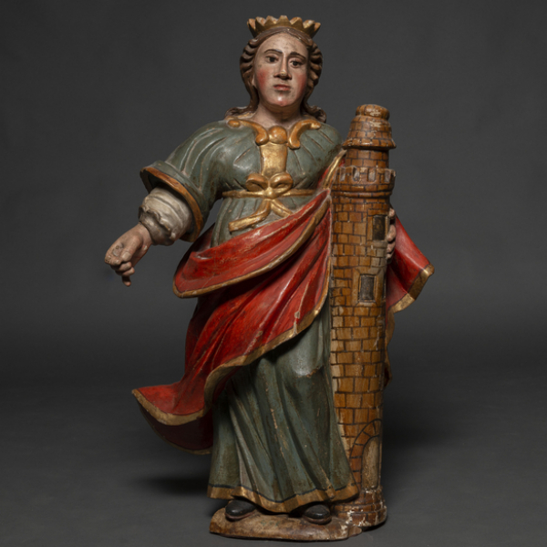 "Santa Barbara" Escultura en madera tallada y policromada del siglo XVII-XVIII