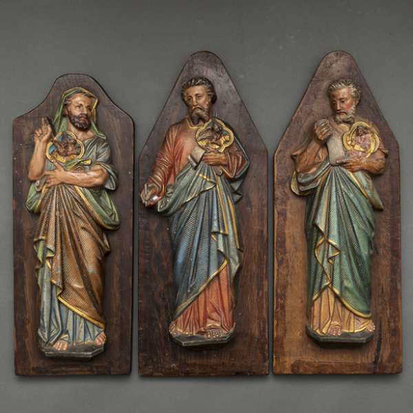 "San Mateo, San Lucas y San Marcos" Conjunto de tres relieves de tres evangelistas en plomo pintado a mano del siglo XIX-XX