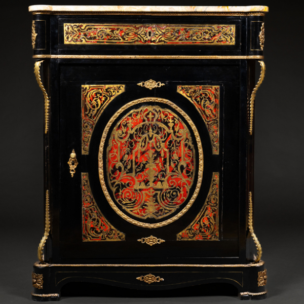 Mueble boulle francés en madera ebonizada en negro con incrustaciones en latón embutido y aplicaciones en bronce, S. XIX