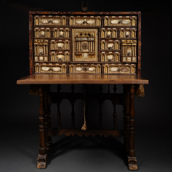 Bargueño Salmantino en madera de nogal, hueso y madera tallada y dorada del siglo XVII